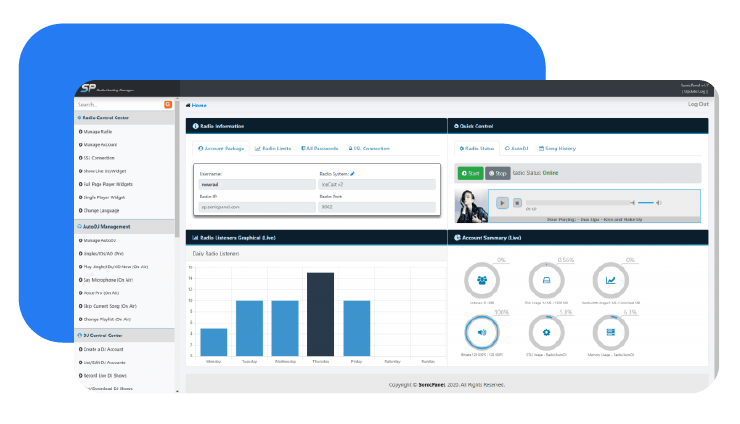 SonicPanel ofrece un potente panel de control para la transmisión de radio con funciones avanzadas como AutoDJ, Shoutcast, IceCast y SSL gratuito.